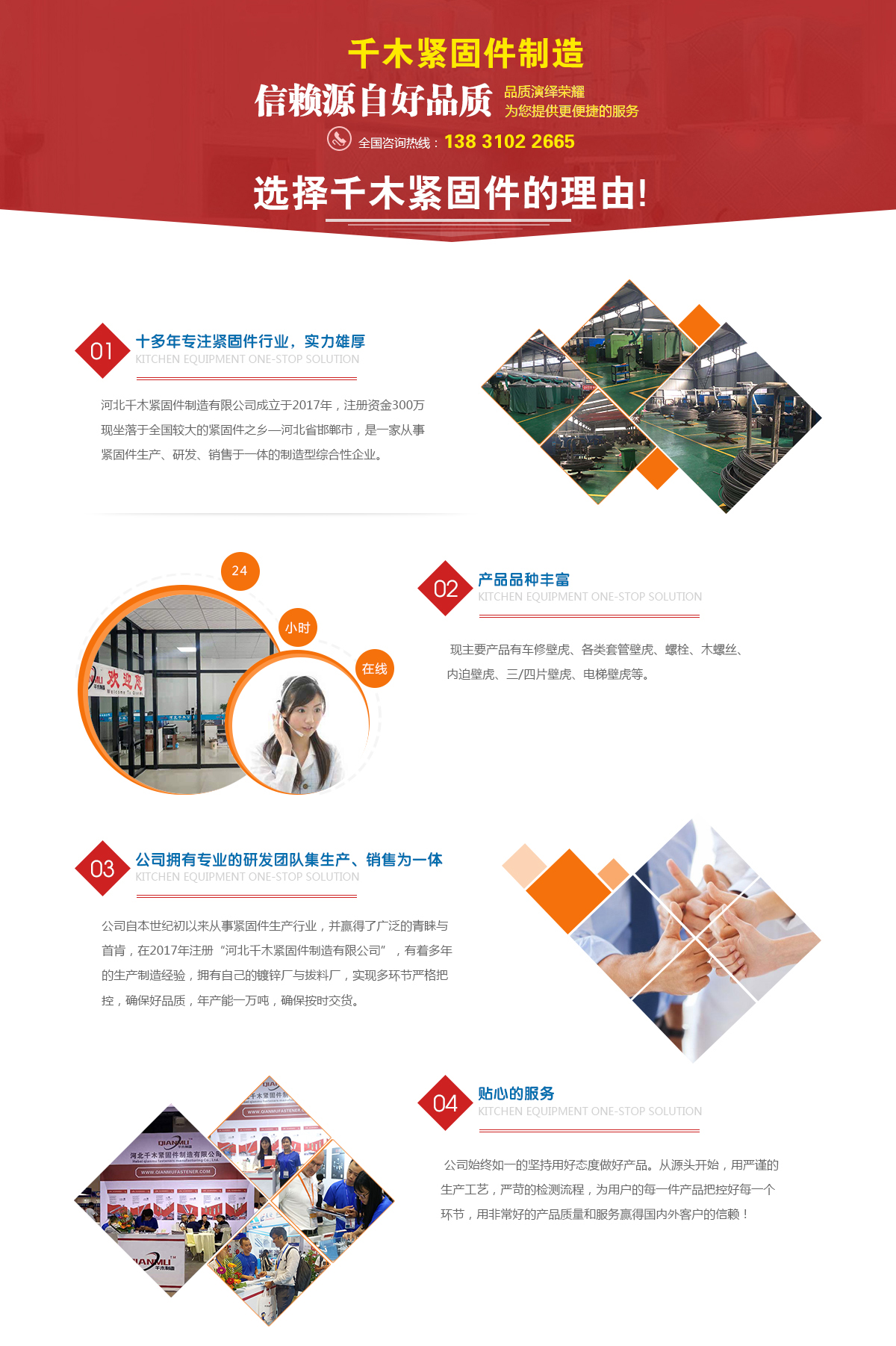 河北千木緊固件制造有限公司現(xiàn)主要產(chǎn)品有車(chē)修壁虎、各類(lèi)套管壁虎、螺栓、木螺絲、內(nèi)迫壁虎、三/四片壁虎、電梯壁虎等。千錘百煉—是我們對(duì)產(chǎn)品的要求;木量心匠—是我們對(duì)做事的態(tài)度。我們相信:只有堅(jiān)持品質(zhì),才能贏(yíng)得未來(lái);只有以人為本,才能屹立世界。 河北千木緊固件制造有限公司成立于2017年,注冊(cè)資金300萬(wàn),現(xiàn)坐落于全國(guó)較大的緊固件之鄉(xiāng)—河北省邯鄲市,是一家從事緊固件生產(chǎn)、研發(fā)、銷(xiāo)售于一體的制造型綜合性企業(yè)。 公司自本世紀(jì)初以來(lái)從事緊固件生產(chǎn)行業(yè),并贏(yíng)得了廣泛的青睞與首肯,在2017年注冊(cè)“河北千木緊固件制造有限公司”,有著多年的生產(chǎn)制造經(jīng)驗(yàn),擁有自己的鍍鋅廠(chǎng)與拔料廠(chǎng),實(shí)現(xiàn)多環(huán)節(jié)嚴(yán)格把控,確保好品質(zhì),年產(chǎn)能一萬(wàn)噸,確保按時(shí)交貨。 現(xiàn)主要產(chǎn)品有車(chē)修壁虎、各類(lèi)套管壁虎、螺栓、木螺絲、內(nèi)迫壁虎、三/四片壁虎、電梯壁虎等。在這十多年的發(fā)展歷程中,我公司擁有了一支充滿(mǎn)激情并具有高素質(zhì)的生產(chǎn),銷(xiāo)售團(tuán)隊(duì),我們將以一萬(wàn)分的熱...